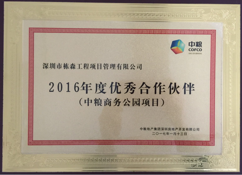 中糧地產集團深圳房地產開發(fā)有限公司2016年度優(yōu)秀合作伙伴 |