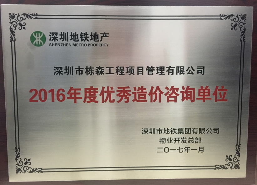 深圳市地鐵集團有限公司物業(yè)開發(fā)總部2016年度優(yōu)秀造價咨詢單位 |